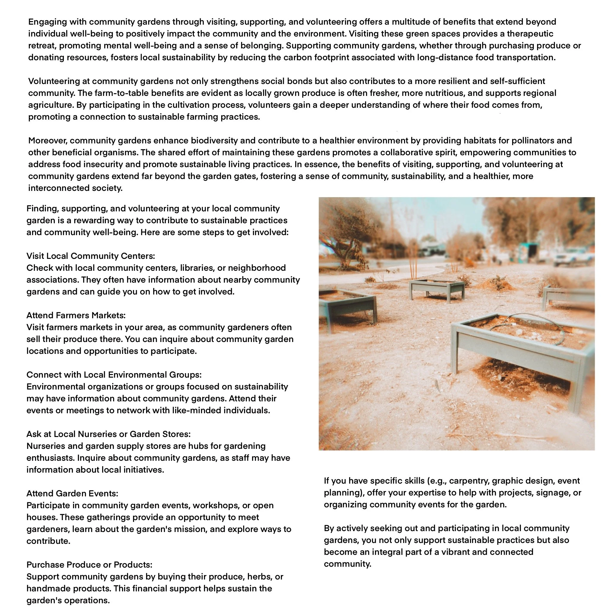 Visiting, supporting, and volunteering at community gardens not only fosters a sense of belonging and connection but also promotes sustainable agriculture, local biodiversity, and a shared commitment to environmental stewardship within the community.